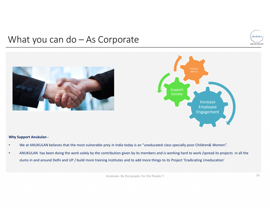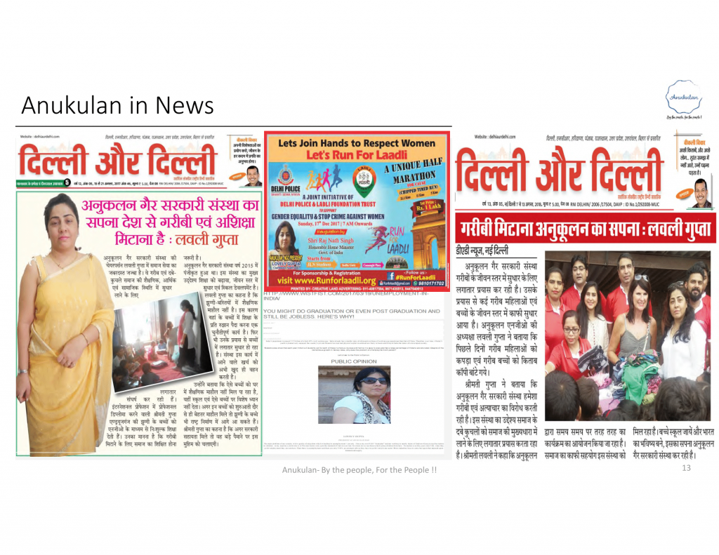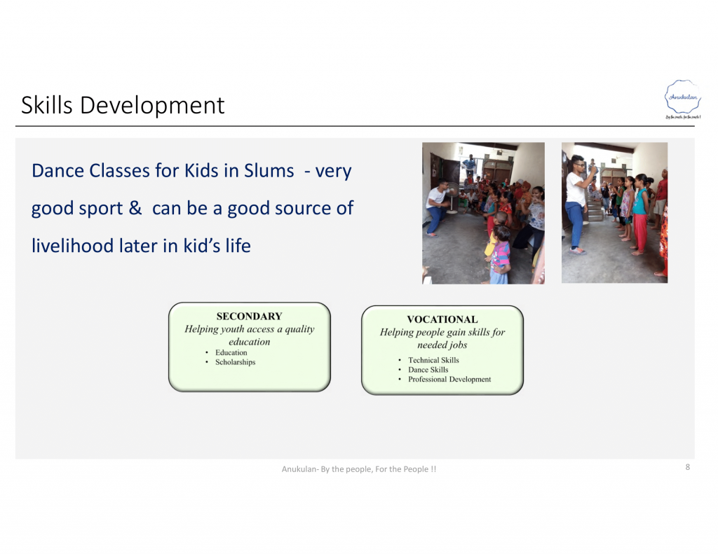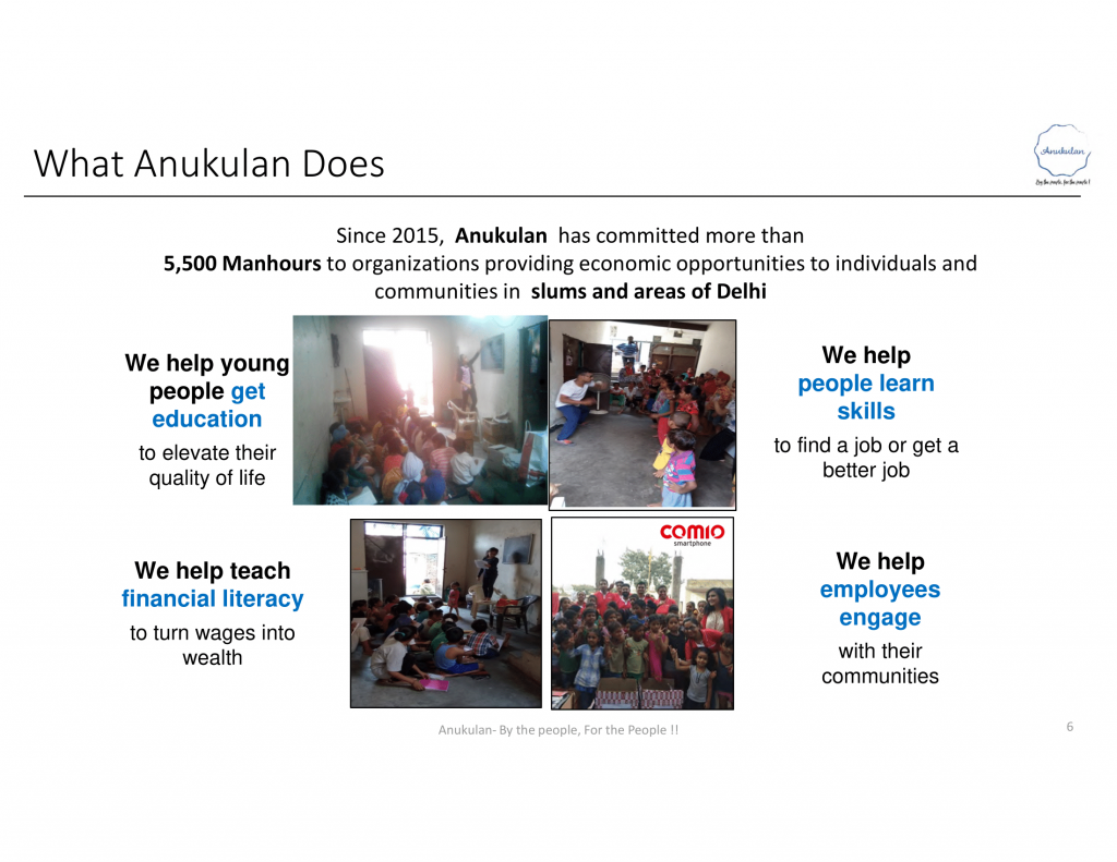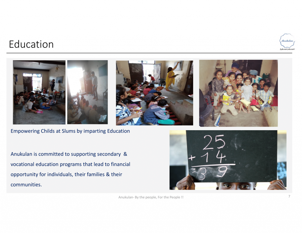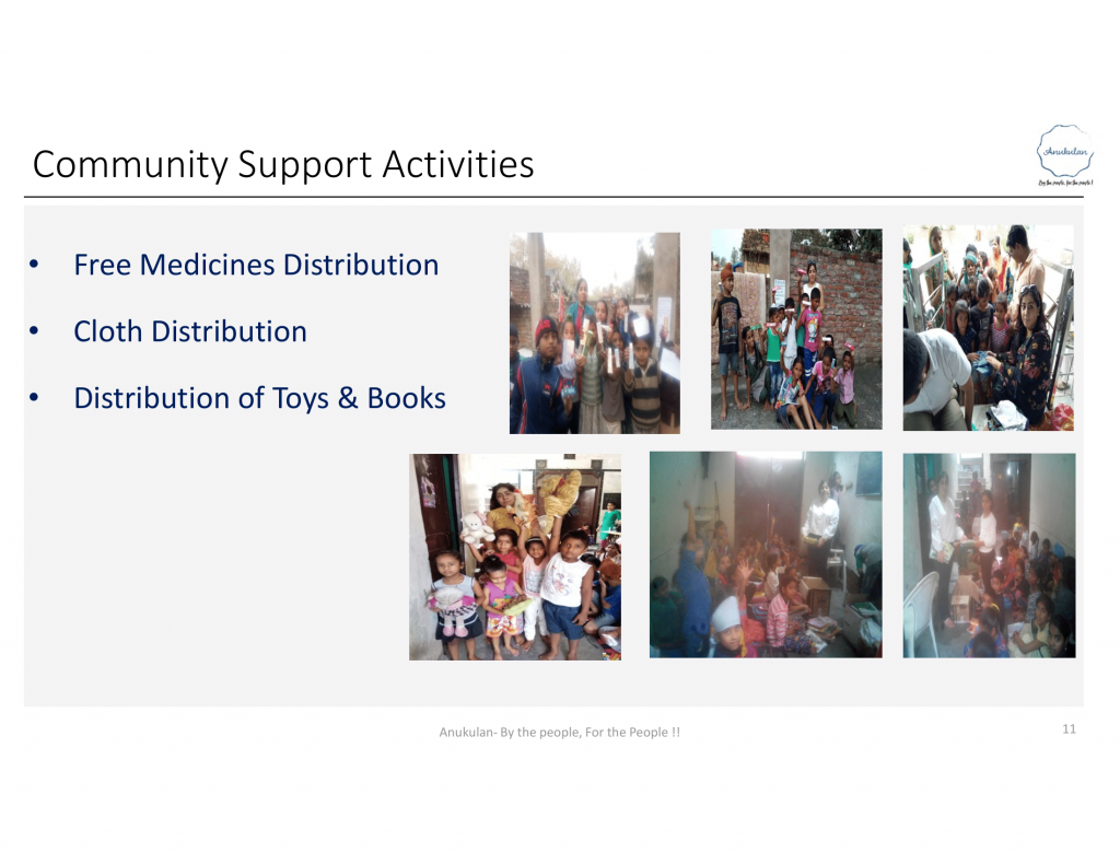 students from the slums of Andrews Ganj in South Delhi. To initiate the project, the team personally visited the slums and educated the parents of children (age group 5 to 15 ) to make them aware of the mission and vision of Anukulan. They encouraged them to get their children registered to Anukulan for free coaching classes. Anukulan got support from the community in-charge and got permission to start taking classes in the Local Gurudwara in the slum. Slowly and gradually the children started coming regularly to Anukulan at the Gurudwara.. Classes are conducted to support these children in their regular school studies and help them to do their homework and give them general knowledge too.Inititally our activities which started with one slum have been spread to Delhi and NCR with maximum children /people being benefitted ..Till date we are able to benefit approx 2,00,000 underprivileged with motto of our NGO